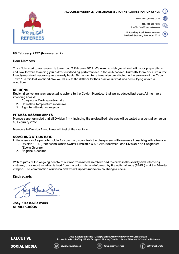 The latest updates and news from the Chairperson of the Western Province Rugby Referees Society.