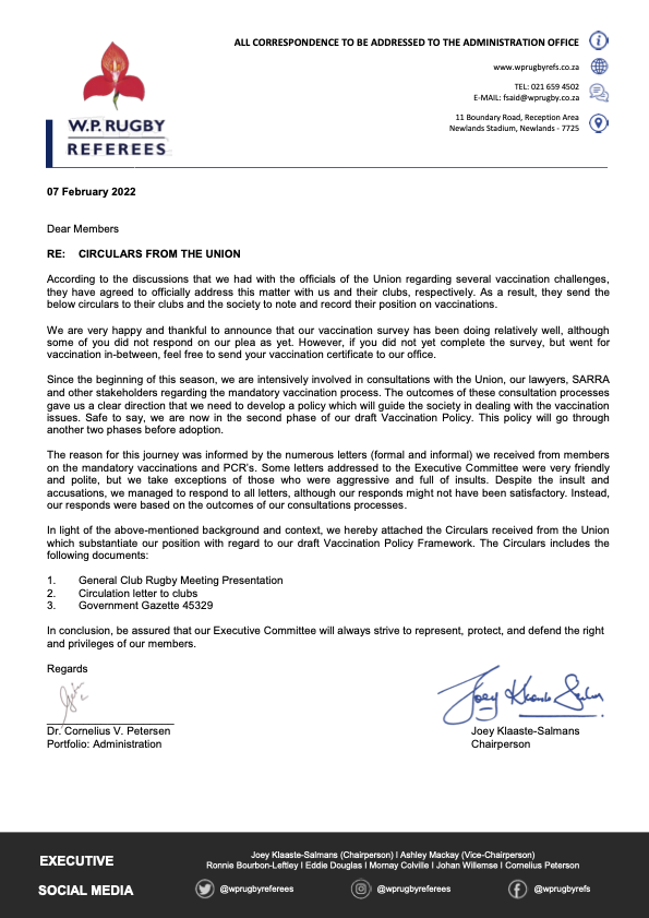 The latest updates and news from the Chairperson of the Western Province Rugby Referees Society.
